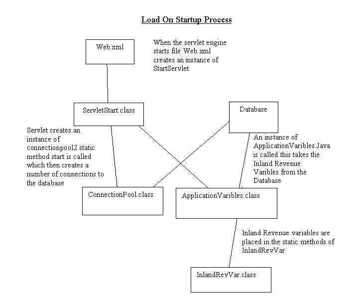 An important part of the application is the start up process carried out automatically when the server is started up. The start up process carries out two important first it initialises a custome built database connectionpool then it takes values used in the payroll process such as the rates of taxation from the database and places them into varible within the application.