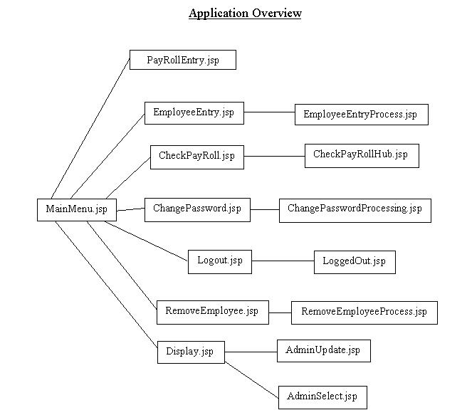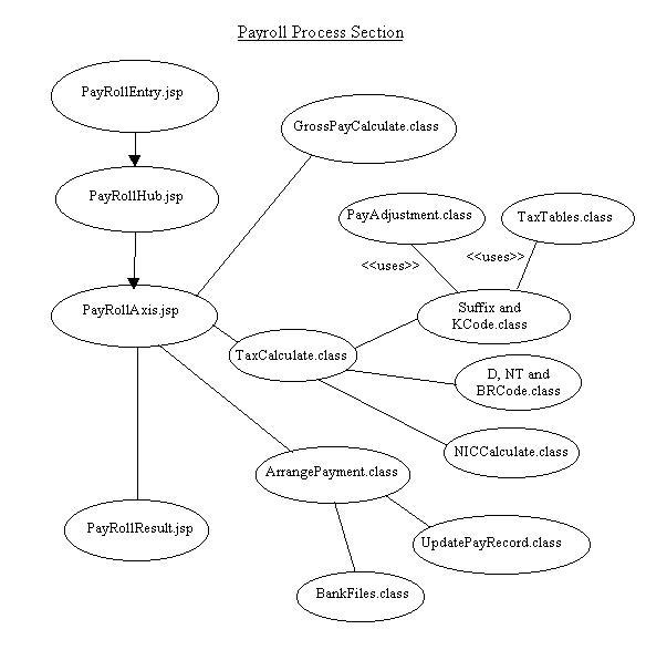 The client companies enter the payroll section of the application from the main menu.The payroll process part of the application is the largest most complicated part consisting of many different JSPs and Classes. The diagram below demonstrates the various JSPs and classes that make up the payroll section of the program. When payroll is carried out it operates as a loop going though each employee taking there past payroll data which is needed for the calculation from the database. This data is placed into an EmployeeObject used to hold the various variable connected to an individual employee.